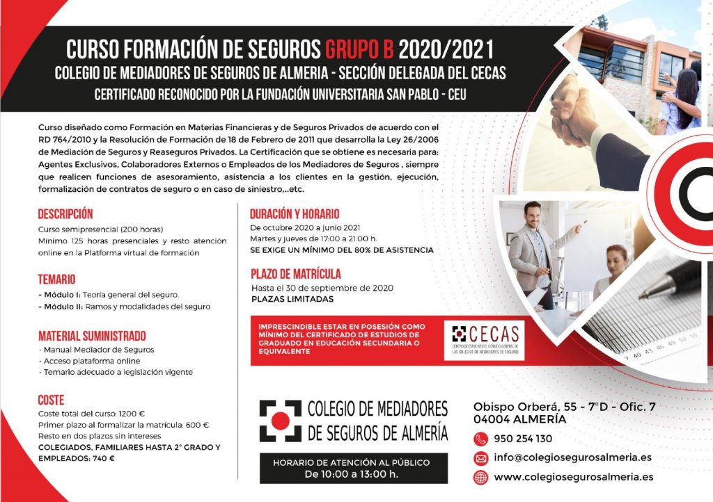 La superación de este curso facilita la Certificación necesaria para Agentes Exclusivos, Colaboradores Externos y empleados de los Mediadores de Seguros, siempre que estos dos últimos colectivos realicen funciones de asesoramiento, asistencia a los clientes en la gestión, ejecución, formalización de contratos de seguro o en caso de siniestro….,etc.